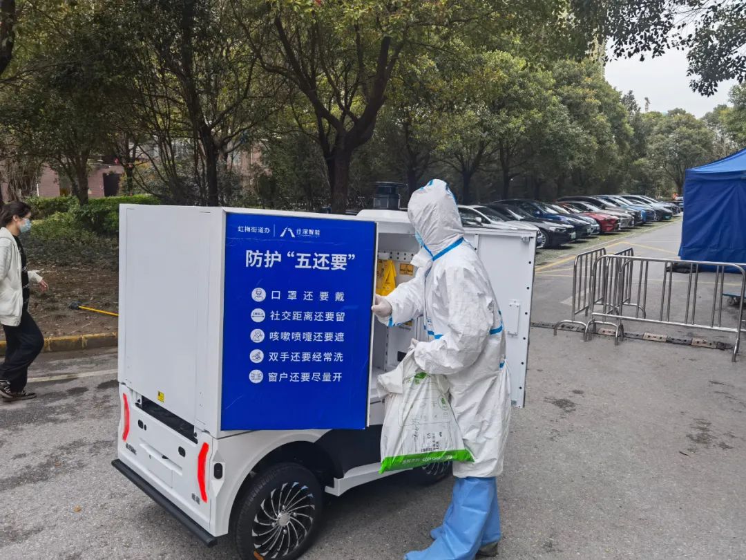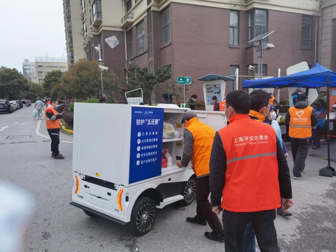 3月18日,徐匯區(qū)虹梅路街道華悅家園在進行封閉管理后,面對8000余人的大型社區(qū),物資配送成為擺在街道和居委面前解決民生保障的第一道難題。街道第一時間聯(lián)系行深智能,公司連夜從蘇州調(diào)配無人車并安排經(jīng)驗豐富的工程師前往封控小區(qū)解決物資配送問題。