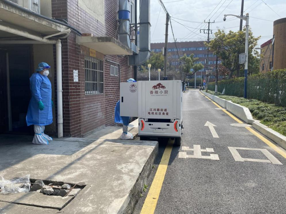 3月30日,無人配送車開進青浦區(qū)華新鎮(zhèn)星尚灣、徐涇鎮(zhèn)羅家錦苑,它們會將餐食等生活物資送到封控樓宇,解決小區(qū)封控執(zhí)勤、保安人員的飲食生活問題。