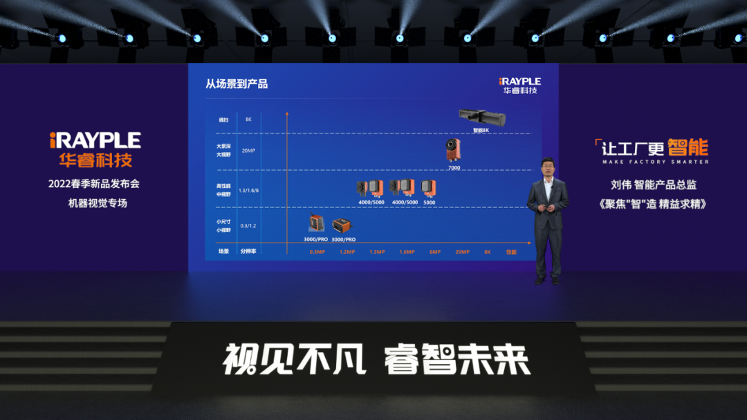 華??萍贾悄芟鄼C產(chǎn)品總監(jiān)劉偉在本次發(fā)布會上以“聚焦‘智’造 精益求精”為主題的新品。他表述:“為了更好的滿足智能制造和信息追溯的快速發(fā)展,服務(wù)于精益智造和精準識別”,本次隆重推出智能讀碼器、智能相機 、3D相機三大類新產(chǎn)品。智能讀碼器系列,圍繞算法、光學(xué)、變焦三方面推新迭代,不斷提高讀碼準確性和速度;提供豐富的光學(xué)配件以及一鍵配件等功能,讓操作部署更簡單。本次共發(fā)布3000/3000PRO/4000/5000/7000/智能線掃系列,分辨率從30萬到2000萬。3000系列讀碼器結(jié)構(gòu)緊湊,可滿足狹小空間安裝;4000系列是一款全新產(chǎn)品,很好地兼顧了高度集成、性能強大和方便易用的特點;5000系列具有60fps高采集幀率,20毫秒級低耗時,可支持3m/s 讀碼;7000系列本次帶來了2000萬全局曝光,做到超大分辨率和超大視野的同時還可以支持更高運動速度,可保障高節(jié)拍和高效率,微妙級的補光時間,減少光污染;8K智能線掃,超高分辨率,光源鏡頭一體化集成設(shè)計。可廣泛應(yīng)用于3C、鋰電、光伏、物流、PCB、汽車、半導(dǎo)體、食品飲料等行業(yè)。