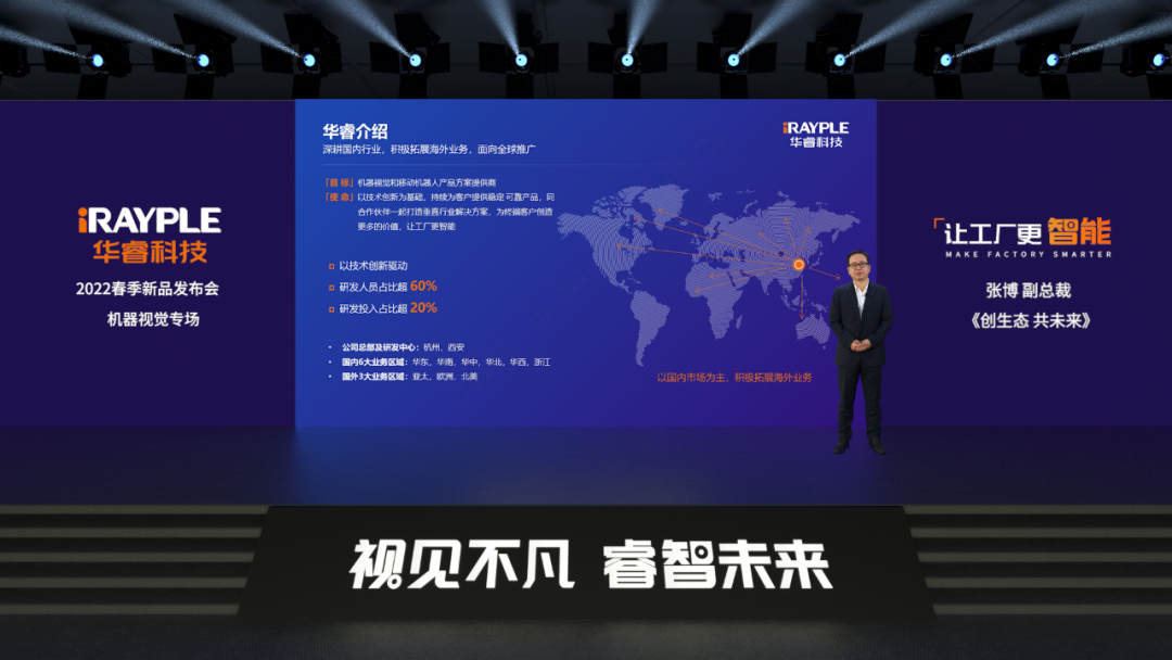 華??萍几笨偛脧埐┰诒敬伟l(fā)布會上發(fā)表了“創(chuàng)生態(tài) 共未來“的主題演講,他表示:“華??萍甲猿闪⒁詠?,一直堅持機器視覺產(chǎn)品提供商的核心定位,堅持產(chǎn)品技術(shù)創(chuàng)新,為客戶提供優(yōu)質(zhì)的產(chǎn)品與解決方案。華睿是一個研發(fā)人員占比近60%,研發(fā)投入占比超過20%的公司,目前公司分設(shè)杭州西安兩大研發(fā)中心。國內(nèi)分成6大業(yè)務(wù)區(qū)域,30多個二級辦,國外有3大業(yè)務(wù)區(qū)域?!?/p>