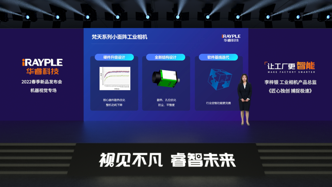 華??萍脊I(yè)相機產(chǎn)品總監(jiān)李梓銀在本次發(fā)布會上帶來了“匠心獨創(chuàng) 捕捉極速”為主題的新品介紹。她表示:“相機成像系統(tǒng)作為視覺檢測的核心模塊,正在不斷滿足行業(yè)高分辨率,高幀率,高畫質(zhì)的要求。全新推出的小尺寸相機搭載CXP-6接口,使小分辨率相機也擁有更高幀率,檢測效率不斷提升,完美應(yīng)用于鋰電、半導(dǎo)體、AOI等行業(yè)。同時也根據(jù)不同行業(yè)應(yīng)用開發(fā)了具有行業(yè)屬性的特色功能,如超短曝光、輪詢、逐點FFC等。