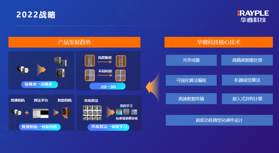 機器視覺未來一個趨勢是從2D視覺走向3D視覺,但目前基于3D的技術(shù)路線較多。”張博這樣說。2022年,華??萍紝诰€激光和雙目結(jié)構(gòu)光技術(shù),推出新款的3D相機和完善3D產(chǎn)品系列。將日趨成熟的MVP算法平臺算法因子移植到相機里面,發(fā)布3000、4000、5000系列讀碼器產(chǎn)品,滿足不同場景讀碼要求。“未來算法將是從傳統(tǒng)算法到深度學(xué)習(xí)的結(jié)合,在2022我們會發(fā)布全新的MVP深度學(xué)習(xí)平臺。”