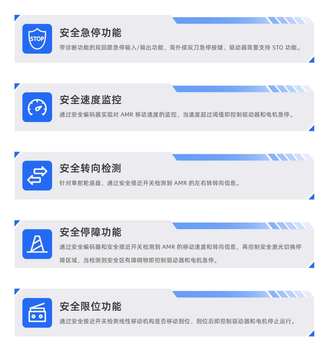 這就意味著通過 SRC-3000FS,無需安全“PLC”,即可搭建滿足 ISO3691-4 國際安全標(biāo)準(zhǔn)的 AMR!由 SRC- 3000FS 打造的 AMR 性能強(qiáng)悍的同時(shí)空間更加緊湊,這不僅降低造 AMR 的難度,還能為客戶提供更多樣的造車選擇,為國產(chǎn) AMR 提供強(qiáng)有力的技術(shù)支持,促進(jìn) AMR 行業(yè)繁榮發(fā)展!