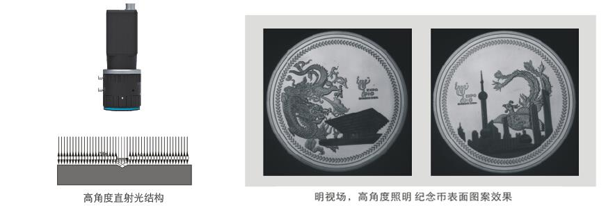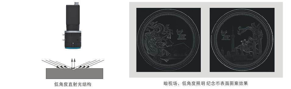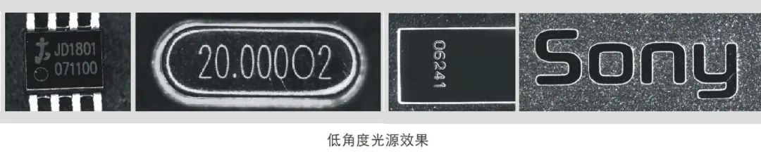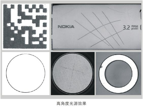 結(jié)構(gòu)描述:高角度照射,表面平整部位反光比較容易進(jìn)入鏡頭,圖像亮度較高;不平整部位反光雜亂,部分光線進(jìn)入不到鏡頭,圖像亮度較低。主要應(yīng)用:表面細(xì)微劃傷檢測,打標(biāo)字符檢測與識別,表面異物檢測,邊緣尺寸測量,定位,沖壓,澆鑄字符圖案監(jiān)測與識別等項目。優(yōu)點(diǎn):效果明顯,細(xì)節(jié)清晰。缺點(diǎn):均勻性調(diào)節(jié)有一定難度。常用光源:高角度環(huán)形光、條形光、面光源、同軸光、點(diǎn)光。高角度光源照射,圖像背景為白色,即明場照射,可以顯現(xiàn)物體表面平整區(qū)域的輪廓特征,表面比較雜亂的劃傷、階梯等特征也可以顯示出來,表面粗糙程度不同或光反射率不同的區(qū)域也會有明顯差異。