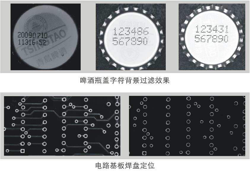 與物體表面自然色相同或相近顏色的光照射到物體上之后,反射率比較高;對比色照射,則反射率較低。利用這一原理,可以實(shí)現(xiàn)加強(qiáng)圖像效果、過濾背景干擾的目的。右圖為啤酒瓶蓋子,檢測目標(biāo)是上面的噴碼,每種蓋子會有不同的背景色和圖樣,如第一幅所示,第二幅和第三幅所使用蓋子為藍(lán)色和綠色背景。選擇和背景顏色一致的光源照射,即可獲得圖中的效果,背景被過濾掉或者大幅削弱,字符檢測和識別不再受干擾。