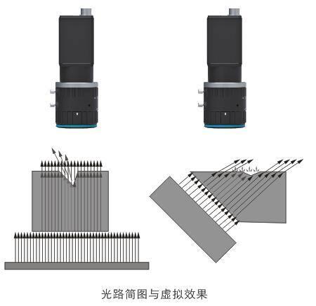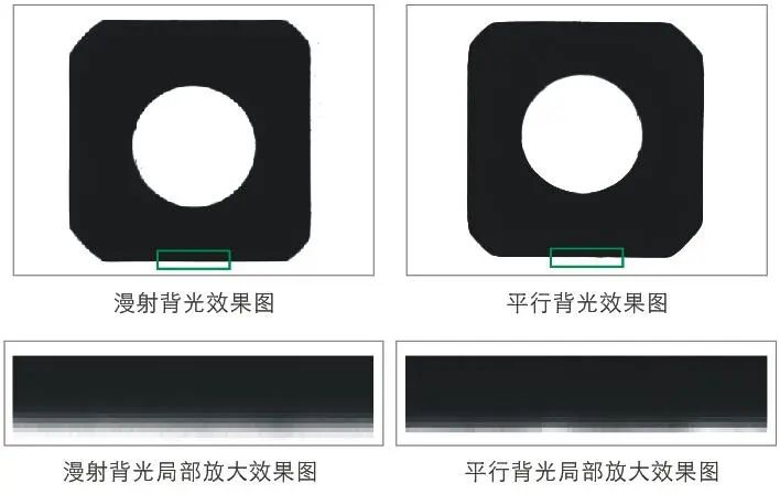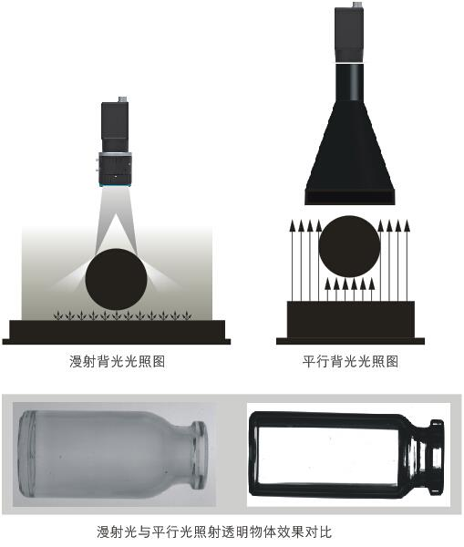漫射光方向比較散亂,被瓶身折射后依然是雜散光,整體上比較均勻,瓶子輪廓與背景對比不明顯。平行光照射情況下,邊緣區(qū)域?qū)⒐饩€折射到鏡頭入瞳之外的區(qū)域,顯示為黑色,與背景對比很明顯。使用漫射背光測量,由于側(cè)部光線被反射進(jìn)入鏡頭,會出現(xiàn)上圖所示的“發(fā)虛”現(xiàn)象,過渡像素較多,無法滿足高精度測量要求,影響測量的精度。使用同樣大小的平行背光測量,全部光線方向統(tǒng)一,圖像邊緣很銳利,像素過度減少。同時配合遠(yuǎn)心鏡頭使用,可以提高成像穩(wěn)定性和精度,也可進(jìn)一步減少環(huán)境雜散光的干擾。