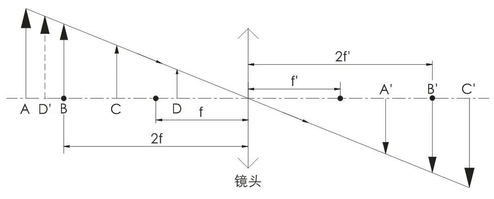5、放大倍率 放大倍率定義為像的大小與物的大小之比。-1<β <0時,物像異側(cè),成倒立縮小的實像,如AA′所示,這就是鏡頭的成像原理。β=-1時,物像異側(cè),成倒立等大的實像,如BB′所示。β<-1時,物像異側(cè),成倒立放大的實像,如CC′所示,這就是顯微鏡的成像原理。β>0時,物像同側(cè),成正立放大的虛像,如DD′所示,這就是放大鏡的成像原理。