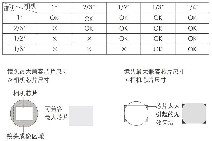 b.最大兼容相機(jī)芯片尺寸最大兼容相機(jī)芯片尺寸指鏡頭能支持的最大清晰成像的范圍。在實際選擇相機(jī)和鏡頭時,要注意所選擇鏡頭的最大兼容芯片尺寸要大于或等于所選擇的相機(jī)芯片的尺寸。以下為常用鏡頭及相機(jī)芯片的兼容性說明: