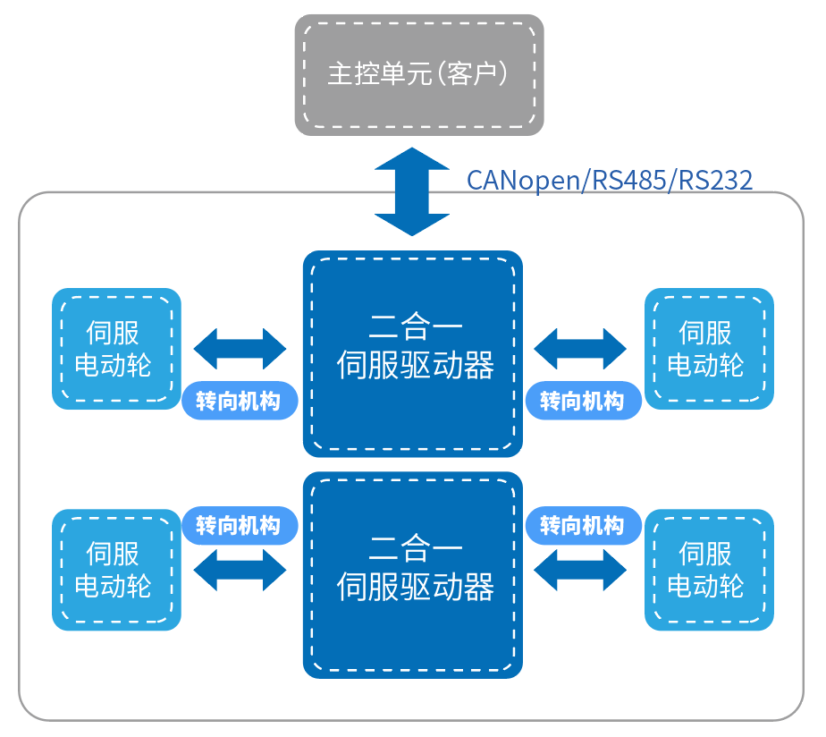 由于低壓伺服電動輪具備單個(gè)車輪獨(dú)立驅(qū)動的特性,因此無論是前驅(qū)、后驅(qū)還是四驅(qū)形式,它都可以比較輕松地實(shí)現(xiàn)。同時(shí),低壓伺服電動輪可以通過左右車輪的不同轉(zhuǎn)速甚至反轉(zhuǎn)實(shí)現(xiàn)類似履帶式車輛的差動轉(zhuǎn)向,大大減小機(jī)器人的轉(zhuǎn)變半徑,甚至可以實(shí)現(xiàn)原地轉(zhuǎn)向。