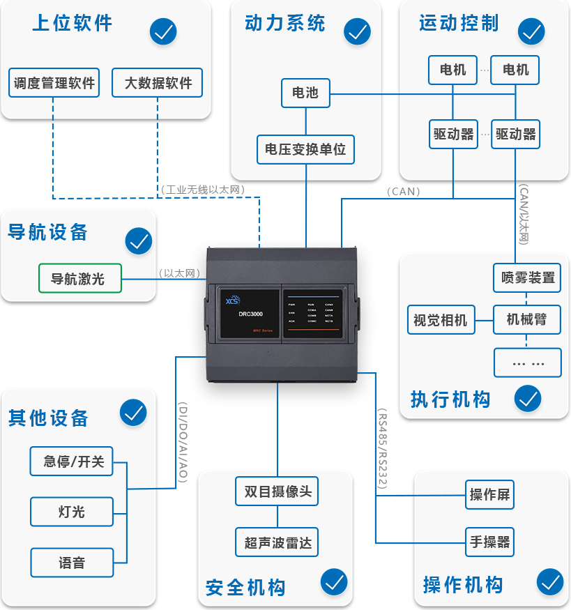 科聰M系列控制器,擁有豐富的接口資源,兼容各種上層工裝機構,可搭載噴霧裝置、機械臂等設備,實現(xiàn)配送、消殺、測溫等工作。實現(xiàn)各個種類機器人。