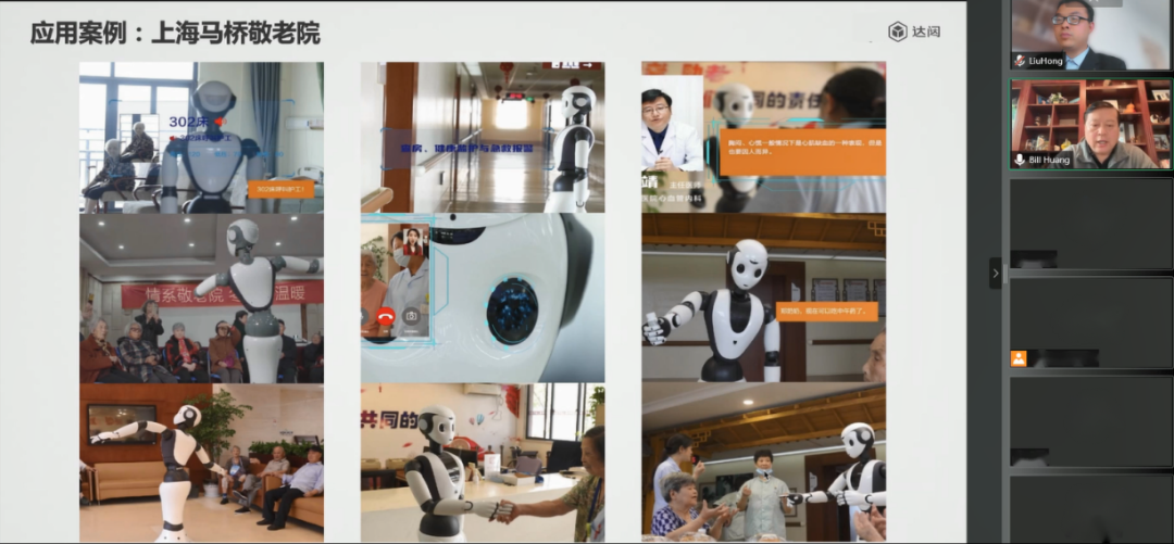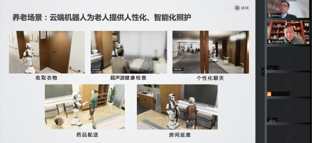 作為智能機器人行業(yè)的領(lǐng)軍企業(yè),達闥很早就開始關(guān)注養(yǎng)老事業(yè),不斷推進機器人、人工智能等技術(shù)的研發(fā)與應(yīng)用,取得了豐碩的成果。2021年,在工信部舉辦的第四屆“綻放杯”5G應(yīng)用征集大賽智慧生活專題賽中,達闥憑借“5G云端機器人的助殘養(yǎng)老應(yīng)用”項目獲得嘉獎,探索出智慧養(yǎng)老、助殘的新模式。黃曉慶在演講中介紹,達闥已經(jīng)在上海等地方為養(yǎng)老院提供一系列智能機器人,可以完成藥品配送、人員出入管理、夜間安全巡邏等工作,還能陪伴老年人聊天、唱歌、跳舞,并具有消毒、測溫等防疫相關(guān)功能,深受老年人歡迎。