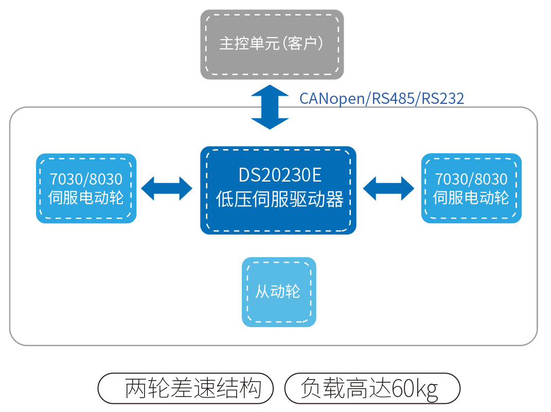 與7030系列/8030系列相配套使用的,是小體積、經(jīng)濟(jì)型DS20230E低壓伺服驅(qū)動(dòng)器。該驅(qū)動(dòng)器采用最新的第三代DSP平臺,利用TMU、FPU、FDIV的強(qiáng)大性能,可對伺服電動(dòng)輪的位置、速度和轉(zhuǎn)矩進(jìn)行精確控制。在硬件上,驅(qū)動(dòng)器采用了小體積功率器件,精簡了輸入輸出端口,并將控制板、功率板兩層PCB板整合為一層,使得驅(qū)動(dòng)器體積大幅度縮小,降低了成本。