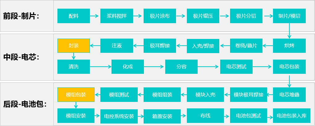 鋰電池產(chǎn)品工藝流程繁雜,按照動力鋰電池生產(chǎn)工藝,所需設備可分為前段配料~制片,中段卷繞~封口,后段化成~檢測,各段間存在大量的上下料搬運工作以及倉儲、物流管理。