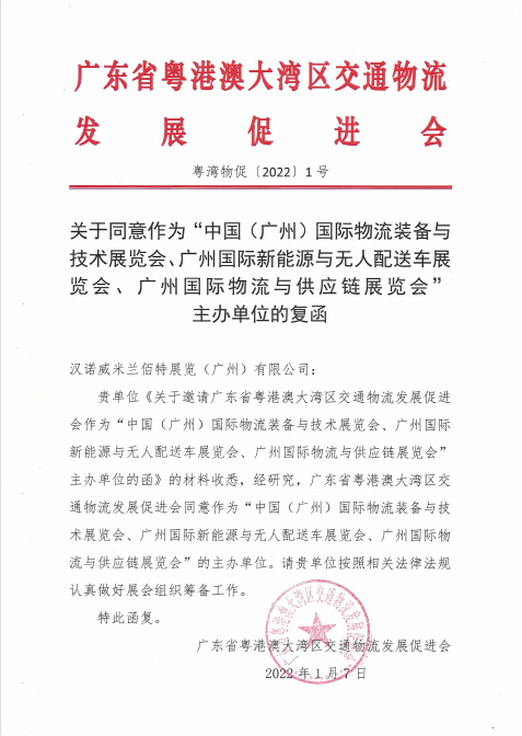 2022漢諾威LET廣州物流展由漢諾威米佰蘭展覽(廣州)有限公司主辦,獲廣東省交通運(yùn)輸廳批文指導(dǎo),與廣東省粵港澳大灣區(qū)交通物流發(fā)展促進(jìn)會(huì)聯(lián)合舉辦。