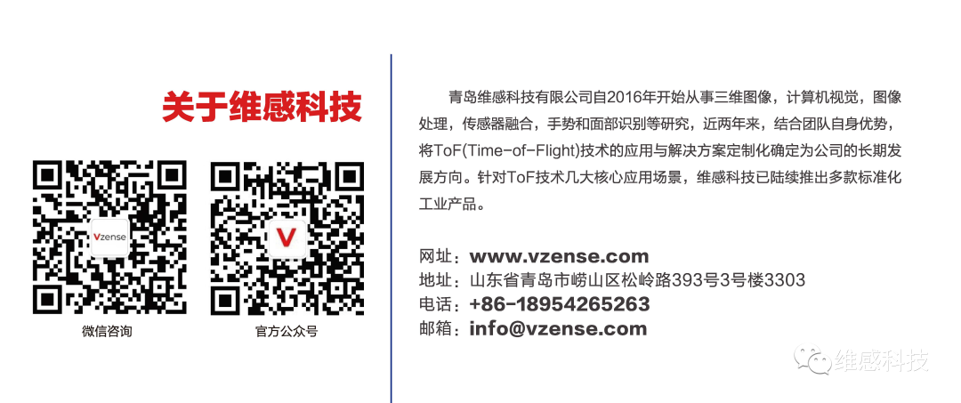 青島維感科技有限公司自2016年開始從事三維圖像,計算機(jī)視覺,圖像處理,傳感器融合,手勢和面部識別等研究,近兩年來,結(jié)合團(tuán)隊自身優(yōu)勢,將ToF(Time-of-Flight)技術(shù)的應(yīng)用與解決方案定制化確定為公司的長期發(fā)展方向。針對ToF技術(shù)幾大核心應(yīng)用場景,維感科技陸續(xù)推出多款標(biāo)準(zhǔn)化工業(yè)產(chǎn)品,同時,結(jié)合具體應(yīng)用需求,與客戶協(xié)同開發(fā)了多款定制化的產(chǎn)品和軟件。產(chǎn)品核心使用場景包括: