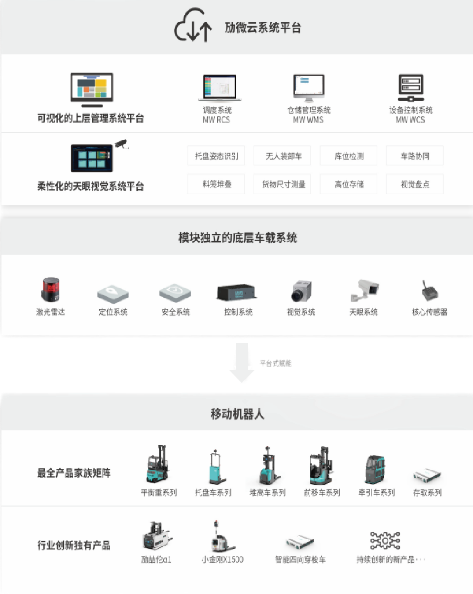 勱微機器人專注于先進的機器人與人工智能技術(shù),為客戶提供完整的智能制造及智慧物流解決方案。硬件產(chǎn)品包括:各類型無人叉車、AMR、無人牽引車及倉儲機器人;軟件系統(tǒng)包括:勱微云、WMS、WCS、現(xiàn)場管理系統(tǒng)及多種視覺解決方案,已在工廠、倉儲、物流等領(lǐng)域交付了大量標桿項目,成為行業(yè)領(lǐng)先客戶信賴的合作伙伴。