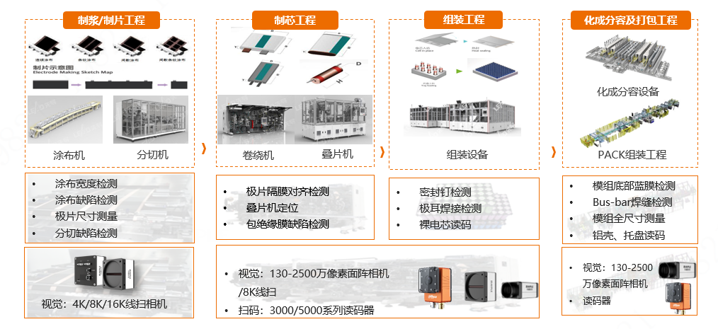 工業(yè)相機(jī)作為鋰電裝備的眼睛,讓檢測明察秋毫,讓追溯識別一目十行。華??萍紡膱D像采集、算法處理、圖像傳輸?shù)杰浖刂?,可提供全系列硬件產(chǎn)品和視覺算法平臺, 4K/8K/16k 多型號的線陣相機(jī)應(yīng)用于涂布尺寸測量和缺陷檢測,在制芯、組裝和打包等工程上的疊片定位、焊縫檢測和藍(lán)膜檢測等不同工藝可選擇不同工業(yè)相機(jī),像素從130萬到2500萬,接口從千兆網(wǎng)接口、Cameralink接口到萬兆網(wǎng)接口,提供豐富的檢測、識別和測量的視覺產(chǎn)品和方案。