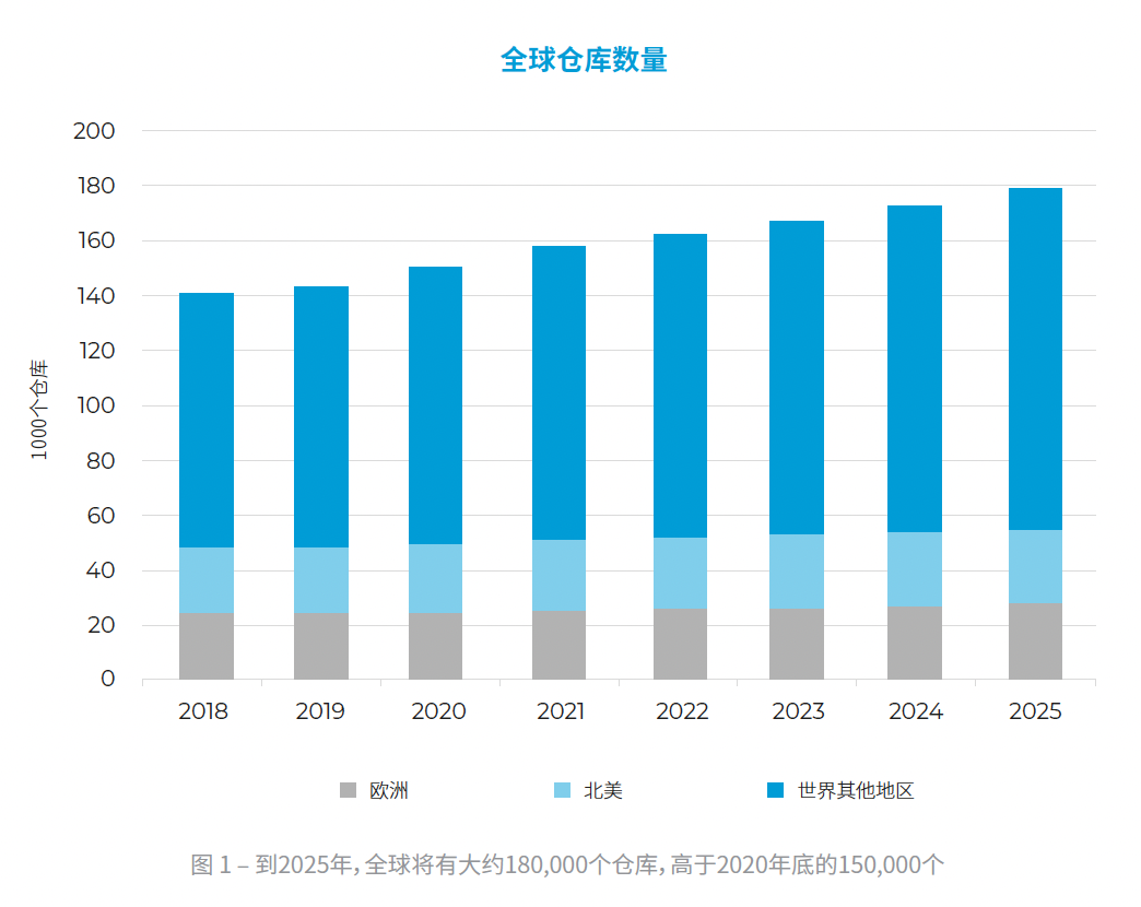 據(jù)Interact Analysis數(shù)據(jù)統(tǒng)計(jì),截至2020年底,全球共有15萬個(gè)倉庫。而到2025年,這一數(shù)字將增長到約18萬。倉儲(chǔ)自動(dòng)化未來市場潛力巨大,不僅僅是因?yàn)殡娮由虅?wù)的發(fā)展進(jìn)一步推動(dòng)了倉庫數(shù)量的激增,目前75%的倉庫還有待自動(dòng)化也證實(shí)了該領(lǐng)域的藍(lán)海市場潛力。