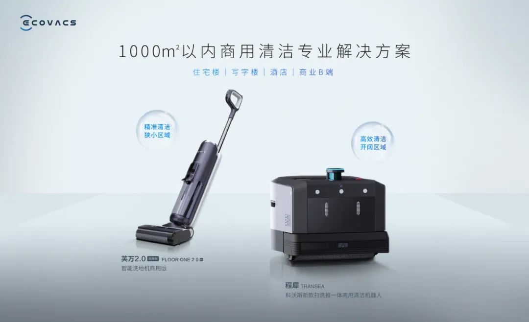 為了滿足中小商用場景地面全域清潔的需求,科沃斯還推出了商用清潔機器人程犀和智能洗地機芙萬2.0商用版(FLOOR ONE 2.0 Biz)組成的商用清潔整體解決方案。其中,兩款智能清潔設(shè)備密切協(xié)作、明確分工——程犀負(fù)責(zé)開闊區(qū)域的高效清潔,芙萬2.0商用版負(fù)責(zé)狹小空間的靈活清潔;此外,對于一些突發(fā)狀況,例如不小心灑落的咖啡等,也可通過芙萬迅速到位、即刻處理。