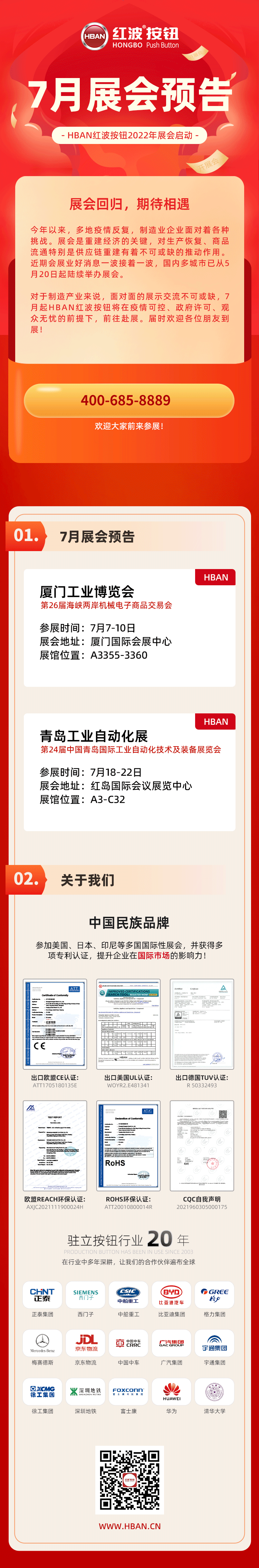 上海紅波電器有限公司注冊商標(biāo)為“HBAN”“紅波”,專注于按鈕開關(guān)及工控電氣領(lǐng)域,為綠色能源和自動化設(shè)備提供高效可靠的產(chǎn)品及解決方案。紅波主要產(chǎn)品:按鈕開關(guān)、金屬按鈕、觸摸開關(guān)、壓電開關(guān)、門禁開關(guān)、信號燈、指示燈、LED發(fā)光器件等產(chǎn)品。在機(jī)械設(shè)備、自動化設(shè)備、機(jī)床設(shè)備、電力電工、船舶機(jī)械、采礦設(shè)備、電梯控制、醫(yī)療設(shè)備、門禁系統(tǒng)、軌道交通、工業(yè)照明等行業(yè)廣泛應(yīng)用。