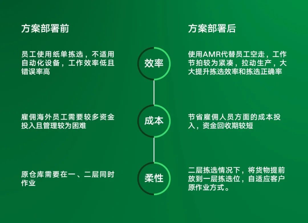 恒藝騰跨境電商海外倉(cāng)現(xiàn)狀及面臨的挑戰(zhàn)恒藝騰信息科技有限公司(以下簡(jiǎn)稱(chēng)為“恒藝騰”),是一家主營(yíng)大件家居用品、戶(hù)外用品跨境出口電商企業(yè),也是一家從事大件家居出口的S2B2C跨境電商平臺(tái)。前身為傳統(tǒng)的家居制造企業(yè),2014年成立跨境電商公司。在美國(guó)擁有家具的自購(gòu)倉(cāng)庫(kù),與多家第三方倉(cāng)庫(kù)和多家物流公司有著長(zhǎng)期穩(wěn)定的合作關(guān)系。目前擁有多個(gè)自有品牌,擁有涵蓋Amazon、Wayfair、Overstock、Home Depot、Walmart等十余家北美主要電商平臺(tái)巨大市場(chǎng),可為本土家居制造企業(yè)提供一站式的出海解決方案。目前的現(xiàn)狀:恒藝騰自運(yùn)營(yíng)倉(cāng)庫(kù)位于美國(guó)新澤西州,總面積約5,000㎡,全倉(cāng)為2層橫梁式貨架;倉(cāng)內(nèi)SKU以家居類(lèi)中大件物品為主,以原包形式貼標(biāo)出庫(kù);訂單類(lèi)型為T(mén)o C,均為來(lái)自線上消費(fèi)者的網(wǎng)站下單。倉(cāng)內(nèi)原揀選方式為人工領(lǐng)取紙質(zhì)訂單,按順序?qū)⒇浳锇嶂镣斜P(pán)上,貼標(biāo)后再由空閑高位叉車(chē)把滿(mǎn)托盤(pán)移動(dòng)到出庫(kù)口輸送線處?;谝陨系那闆r,恒藝騰在倉(cāng)內(nèi)物流揀選方面面臨了不小的難題:(1)揀選效率低下:倉(cāng)內(nèi)無(wú)自動(dòng)化設(shè)備及工具,當(dāng)天的揀選任務(wù)完不成則會(huì)放到第二天繼續(xù)作業(yè),大大影響出貨效率;(2)揀選錯(cuò)誤率高:人工按照紙質(zhì)單據(jù)揀選后則直接出庫(kù),經(jīng)常存在發(fā)貨錯(cuò)誤的情況,公司只能獨(dú)自承擔(dān)由揀選錯(cuò)誤給買(mǎi)家?guī)?lái)的經(jīng)濟(jì)損失,且金額較大;(3)人員成本高,難管理:倉(cāng)庫(kù)人員管理、雇傭成本較高,且華人公司聘用當(dāng)?shù)貑T工,存在一定文化差異,難以規(guī)范化管理。采用AMR解決方案是否可以有效緩解恒藝騰之痛?恒藝騰在對(duì)多家AMR解決方案進(jìn)行考察后,選用了靈動(dòng)科技“訂單到人”中件倉(cāng)柔性揀選解決方案:
