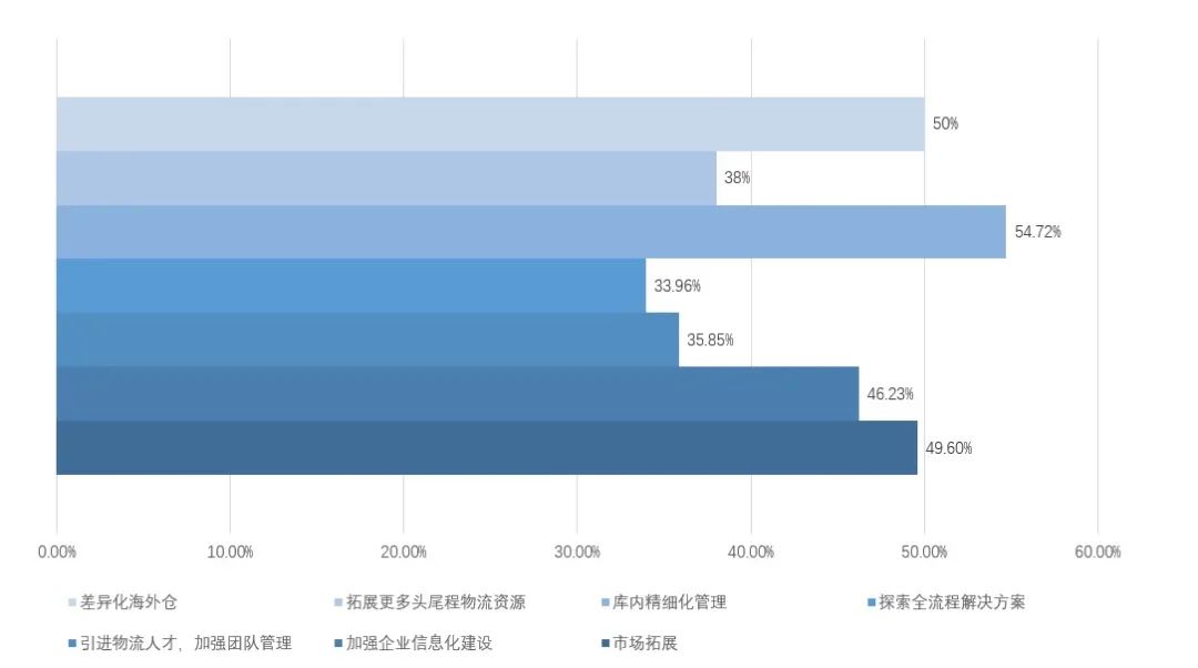 然而,海外倉(cāng)在緩解跨境電商物流之痛的同時(shí),其本身在倉(cāng)儲(chǔ)物流方面也面臨著多重挑戰(zhàn),據(jù)調(diào)研,54.72%的海外倉(cāng)企業(yè)將在2022年側(cè)重“庫(kù)內(nèi)精細(xì)化管理”,希望通過(guò)規(guī)范庫(kù)內(nèi)作業(yè)流程、研發(fā)或引入倉(cāng)庫(kù)管理系統(tǒng)、提升倉(cāng)內(nèi)自動(dòng)化等手段,提高海外倉(cāng)的出入庫(kù)、揀選、打包效率等。有50%以上的企業(yè)把“打造差異化海外倉(cāng)”作為2022年的重點(diǎn)發(fā)展方向。