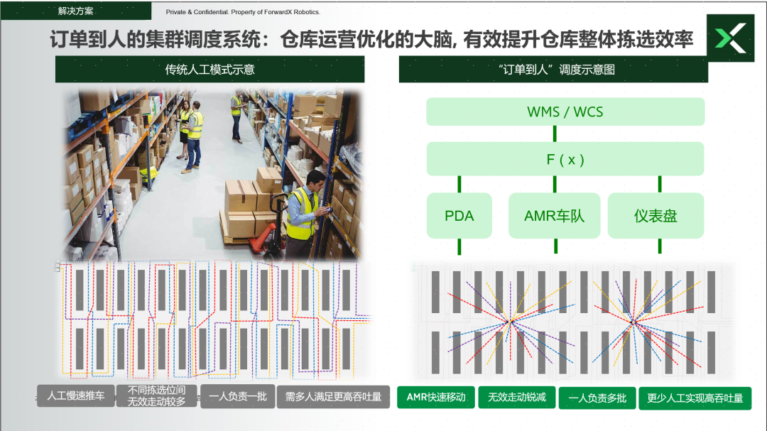 具體來(lái)看,f(x)集群調(diào)度系統(tǒng)在對(duì)接倉(cāng)庫(kù)的原始客戶訂單后,可根據(jù)優(yōu)先級(jí)等因素形成訂單池;在每個(gè)訂單池內(nèi),會(huì)根據(jù)不同策略進(jìn)行智能組單,組單結(jié)果派發(fā)給AMR,并對(duì)AMR發(fā)出大規(guī)模調(diào)度指令:包括管理AMR艦隊(duì)在倉(cāng)內(nèi)分布,并調(diào)控揀貨人員分布,最終實(shí)現(xiàn)優(yōu)化揀貨員行走路線,大幅提升揀貨效率。