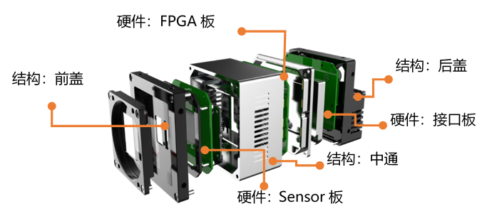 2018年起,華睿科技就將“模塊化“的結(jié)構(gòu)設(shè)計(jì)理念應(yīng)用于大面陣工業(yè)相機(jī)的各個(gè)產(chǎn)品系列中。這種獨(dú)具前瞻性的設(shè)計(jì)理念,也為華??萍荚诖竺骊嚬I(yè)相機(jī)產(chǎn)品系列的開發(fā)中贏得了寶貴時(shí)間,讓我們?cè)诙潭虜?shù)年間,迅速做到多種數(shù)據(jù)傳輸接口、超大分辨率范圍的迅速覆蓋,同時(shí)還可促進(jìn)產(chǎn)品的迅速迭代。模塊化結(jié)構(gòu)設(shè)計(jì)的中心思想就是“靈活的拼接”,就仿佛“搭積木”般,將結(jié)構(gòu)件:前蓋、中通、后蓋與硬件PCB板:Sensor板、FPGA板與接口板進(jìn)行拼接組合,適應(yīng)市場(chǎng)中多樣的分辨率和接口需求,大大縮短了開發(fā)時(shí)間,用以響應(yīng)多變的市場(chǎng)需求。