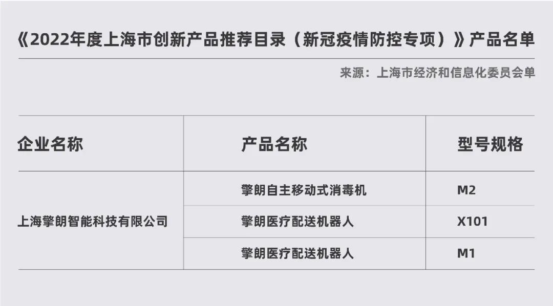 同時,擎朗醫(yī)療X101、M1以及M2系列入選《2022年度上海市創(chuàng)新產(chǎn)品推薦目錄(新冠疫情防控專項)》產(chǎn)品名單,獲得了上海市經(jīng)濟和信息化委員會的表彰認可。