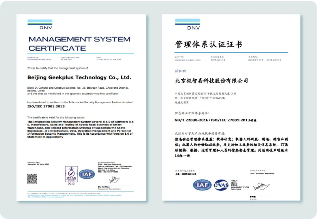 ▲ 極智嘉榮獲ISO27001及GB/T22080權(quán)威信息安全管理體系認證