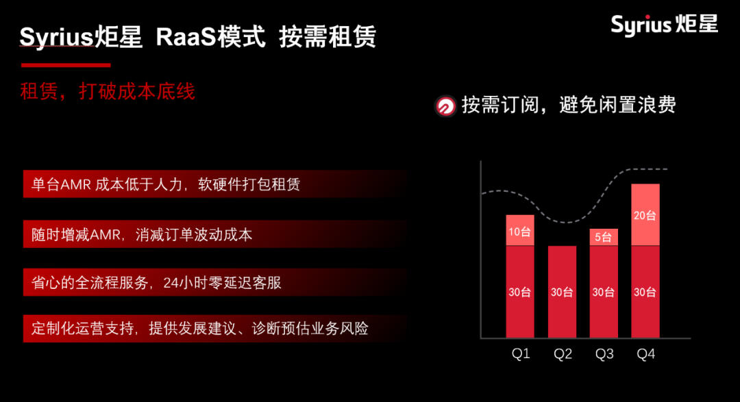 Syrius炬星正在提供簡單、耐用、同時低門檻、高效益的解決方案和產(chǎn)品,并通過機(jī)器人租賃(RaaS)的模式幫助客戶把成本進(jìn)一步降下來,解決客戶在成本和效益上的平衡是現(xiàn)階段我們的核心目標(biāo)。