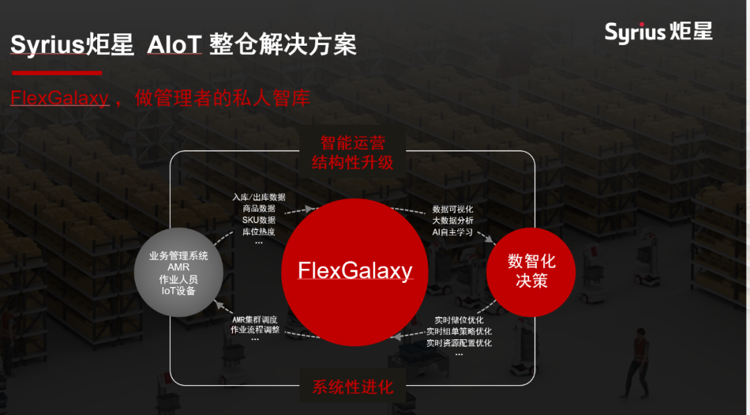 Syrius炬星提供一個云服務(wù)平臺產(chǎn)品"FlexGalaxy",這個服務(wù)一方面提供集群,特別是機(jī)器人集群的協(xié)作的基礎(chǔ)。另外一方面也給我們的客戶、倉儲運營的人員和關(guān)心倉儲運營情況的人員提供數(shù)字化看板。以數(shù)字?jǐn)?shù)據(jù)為核心,以軟件為中心,充分結(jié)合AMR和數(shù)字化技術(shù)就是我們這個解決方案的核心。