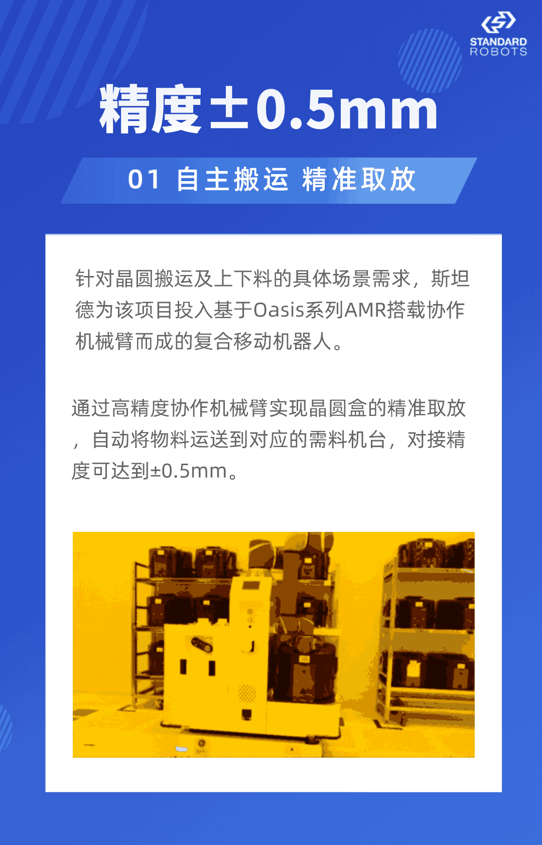 國內(nèi)某知名半導(dǎo)體晶圓制造企業(yè)自2020年開始在多個(gè)廠區(qū)累計(jì)投入近50臺(tái)斯坦德潛伏式和復(fù)合式AMR,實(shí)現(xiàn)了整廠生產(chǎn)物流自動(dòng)搬運(yùn)及智能化管理,使整個(gè)生產(chǎn)智能化程度邁上一個(gè)新臺(tái)階。