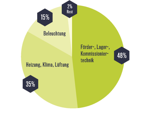 雖然綠色物流在運(yùn)輸領(lǐng)域已經(jīng)很普遍,但在內(nèi)部物流領(lǐng)域,特別是在貨物處理方面,仍然有很多未開發(fā)的潛力。只要想想使用可持續(xù)的產(chǎn)品包裝和可重復(fù)使用的負(fù)載載體,或者避免閑置的消費(fèi)。像這樣的措施不僅能保護(hù)環(huán)境,還能保護(hù)預(yù)算。此外,能源消耗因素也不應(yīng)被忽視。物流大廳的節(jié)約潛力尤其大:平均而言,近50%的能源流向輸送、存儲(chǔ)和訂單揀選技術(shù)。高達(dá)35%的電力消耗歸因于加熱、冷卻或通風(fēng),而照明則占另外15%。