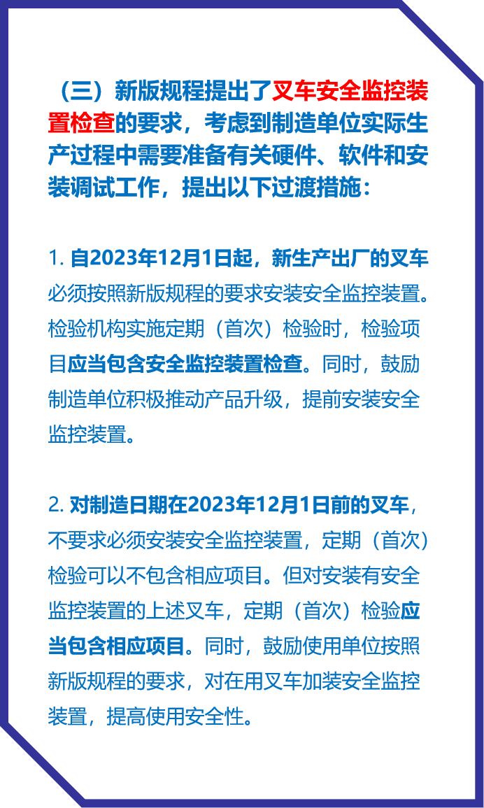 考慮到一些制造廠商需要進(jìn)行硬件、軟件、安裝測試等一系列的準(zhǔn)備工作,新版規(guī)程針對叉車安全提出了一些過渡措施,將新出廠叉車的一些檢驗(yàn)項(xiàng)目推遲到了2023年12月1日起施行。