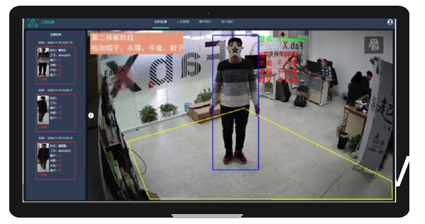 實時檢測識別區(qū)域內(nèi)人員的身份信息,對身份不正確的員工進行語音告警。實時檢測識別區(qū)域內(nèi)人員的服裝穿戴,對服裝穿戴不規(guī)范的員工進行告警。