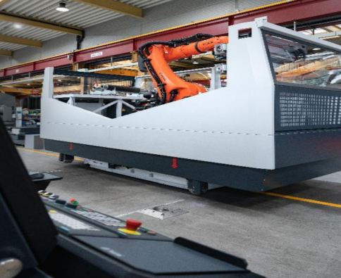 一個大尺寸的自動導(dǎo)引車(AGV),其機器人單元的設(shè)計包含了你需要的一切。換句話說,機器人、工件和工具夾持器,以及工件和工具的緩沖位置,還有必要的控制和安全技術(shù)。機器可以自由進出。它沒有被堵塞或阻擋。