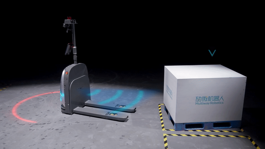 其原理在于,通過(guò)在車(chē)身搭載視覺(jué)AI檢測(cè)相機(jī),探測(cè)托盤(pán)位置,無(wú)人叉車(chē)將在取貨前分析托盤(pán)位置、進(jìn)行精確計(jì)算,并重新規(guī)劃路線、叉取托盤(pán)。
