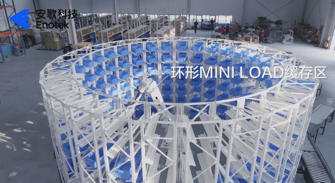 2、含有1臺(tái)機(jī)械臂的360度Miniload暫存系統(tǒng),共780個(gè)料箱貨位;