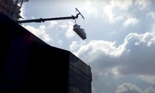 機器人從建筑物維護單元(一種類似起重機的設(shè)備)下降到所有高層建筑中。