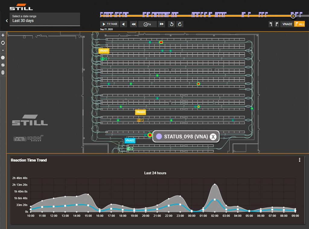 AGV由一個運(yùn)輸和交通控制系統(tǒng)控制和監(jiān)測。叉車式AGV的訂單由SAP主機(jī)中的倉庫管理系統(tǒng)生成,并傳輸?shù)娇刂葡到y(tǒng)中。大量有用的數(shù)據(jù)晝夜不停地產(chǎn)生,這些數(shù)據(jù)被用來對自動化倉庫以及微軟云中的流程從更高的角度進(jìn)行全面分析。通過iGo Insights,Still提供了一個評估工具,從云端收集的大量流程信息中過濾出相關(guān)信息,并得出具體的行動建議。