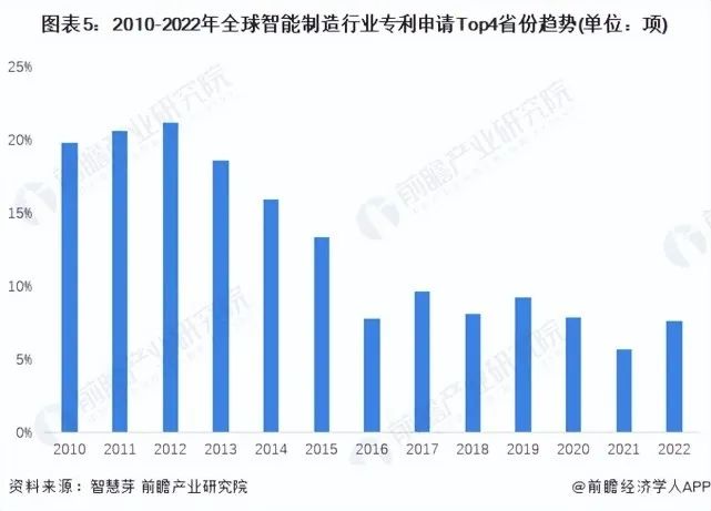 根據(jù)智慧芽的數(shù)據(jù),2011-2022年,全球智能制造行業(yè)的專利申請集中度呈現(xiàn)出波動下降的整體趨勢,從2010年的19.74%下降至2022年的7.62%,下降了12.12個百分點(diǎn)。整體來看,全球智能制造行業(yè)專利申請人集中度較低。