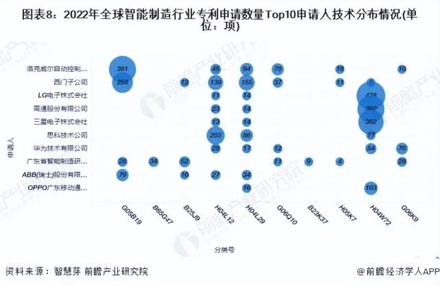 全球智能制造行業(yè)專利申請數(shù)量TOP10申請人分別是高通股份有限公司、LG電子株式會社、西門子公司、洛克威爾自動控制技術(shù)股份有限公司、三星電子株式會社、廣東省智能制造研究所、上工富怡智能制造(天津)有限公司、邵東智能制造技術(shù)研究院有限公司、OPPO廣東移動通信有限公司和華為技術(shù)有限公司。