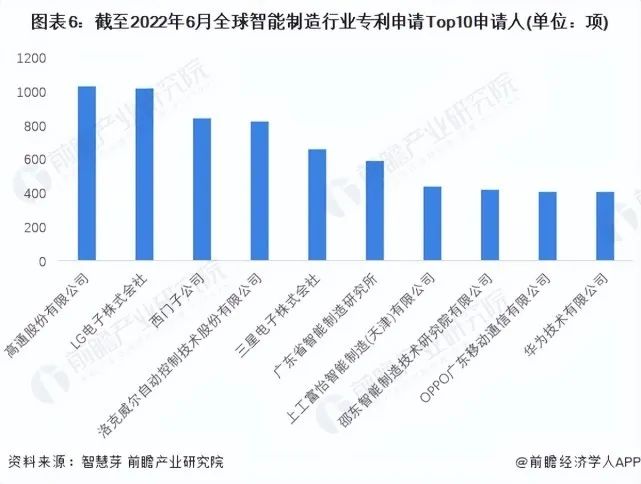 其中,高通股份有限公司智能制造專利申請數(shù)量最多,為1028項。LG電子株式會社排名第二,其智能制造專利申請數(shù)量為1018項。