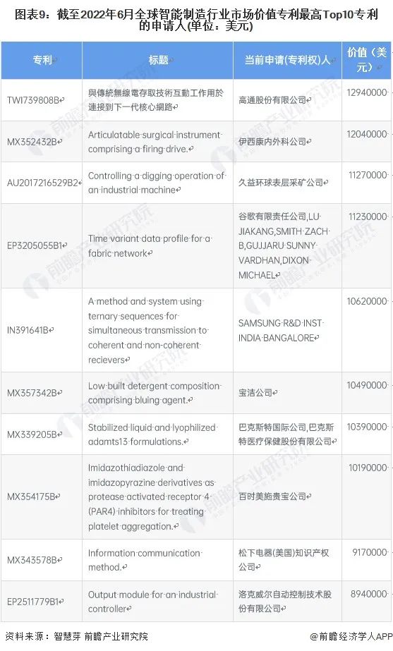 在全球智能制造行業(yè)市場價值最高的10項專利中,申請人各不相同。從排名最高的三項專利的申請人來看,分別是高通股份有限公司、伊西康內(nèi)外科公司和久益環(huán)球表層采礦公司。