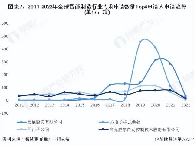 趨勢方面,2011-2016年,全球前4大智能制造行業(yè)專利申請人申請的專利數(shù)量差距不大,2017年與2018年,各大企業(yè)逐漸發(fā)力,LG電子株式會社的申請量在2019年有了大幅度上升,但進(jìn)入2020年后,申請量便又快速回落。