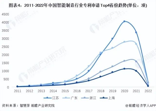 從我國智能制造行業(yè)專利申請數(shù)量的省份分布來看,江蘇省智能制造相關(guān)專利的申請數(shù)量最多,截至2022年6月15日,共計申請15068項;其次是廣東省,共計申請13047項。