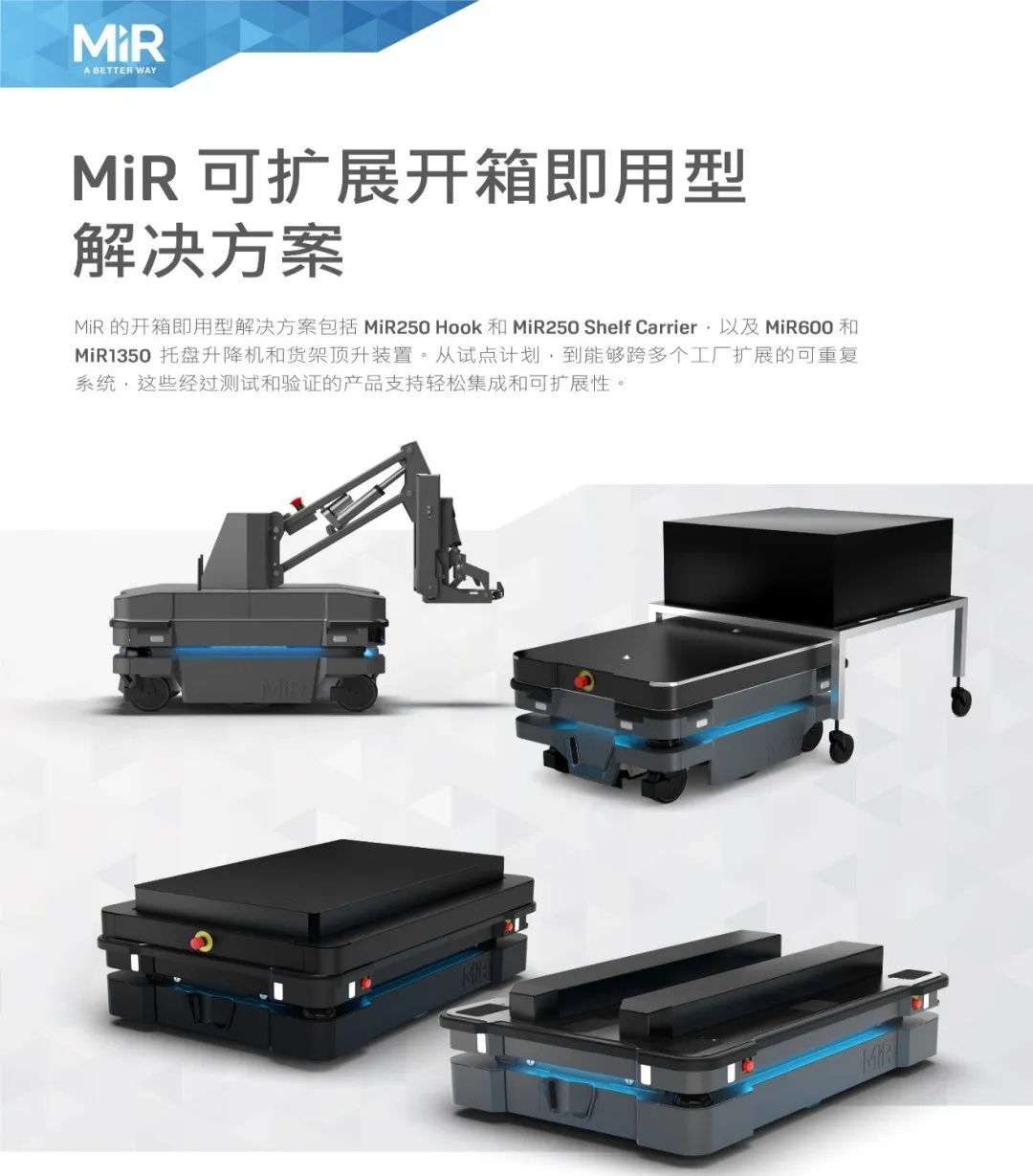 MiR致力于研發(fā)簡(jiǎn)單易用且靈活安全的機(jī)器人,幫助各類公司提高運(yùn)營(yíng)效率。MiR的自主機(jī)器人是新一代的先進(jìn)移動(dòng)機(jī)器人,具有投資回報(bào)快的特點(diǎn),通常一年內(nèi)就能收回成本。這些獨(dú)特的協(xié)作機(jī)器人現(xiàn)已在工業(yè)及醫(yī)療保健行業(yè)大放異彩,幫助這些行業(yè)的制造商實(shí)現(xiàn)內(nèi)部運(yùn)輸自動(dòng)化。