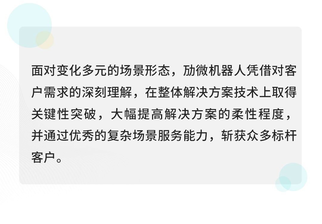 作為智能物流基礎(chǔ)設(shè)施構(gòu)建者,勱微機(jī)器人始終聚焦各領(lǐng)域、各場景的實(shí)際需求,以安全可靠的機(jī)器人產(chǎn)品及其解決方案幫助客戶解決痛點(diǎn)問題,并通過軟硬件一體化交付平臺(tái)、卓越的復(fù)雜場景服務(wù)能力,實(shí)現(xiàn)20多個(gè)行業(yè)場景覆蓋、助力300多家企業(yè)智能物流升級。