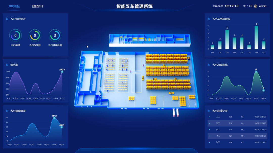 管理人員能夠通過(guò)車聯(lián)網(wǎng)系統(tǒng)對(duì)當(dāng)日故障數(shù)、每臺(tái)車輛避障監(jiān)測(cè)數(shù)量、叉車沖擊檢測(cè)報(bào)告等進(jìn)行數(shù)據(jù)分析,便于對(duì)車輛進(jìn)行管理以及分析工作狀態(tài)。
